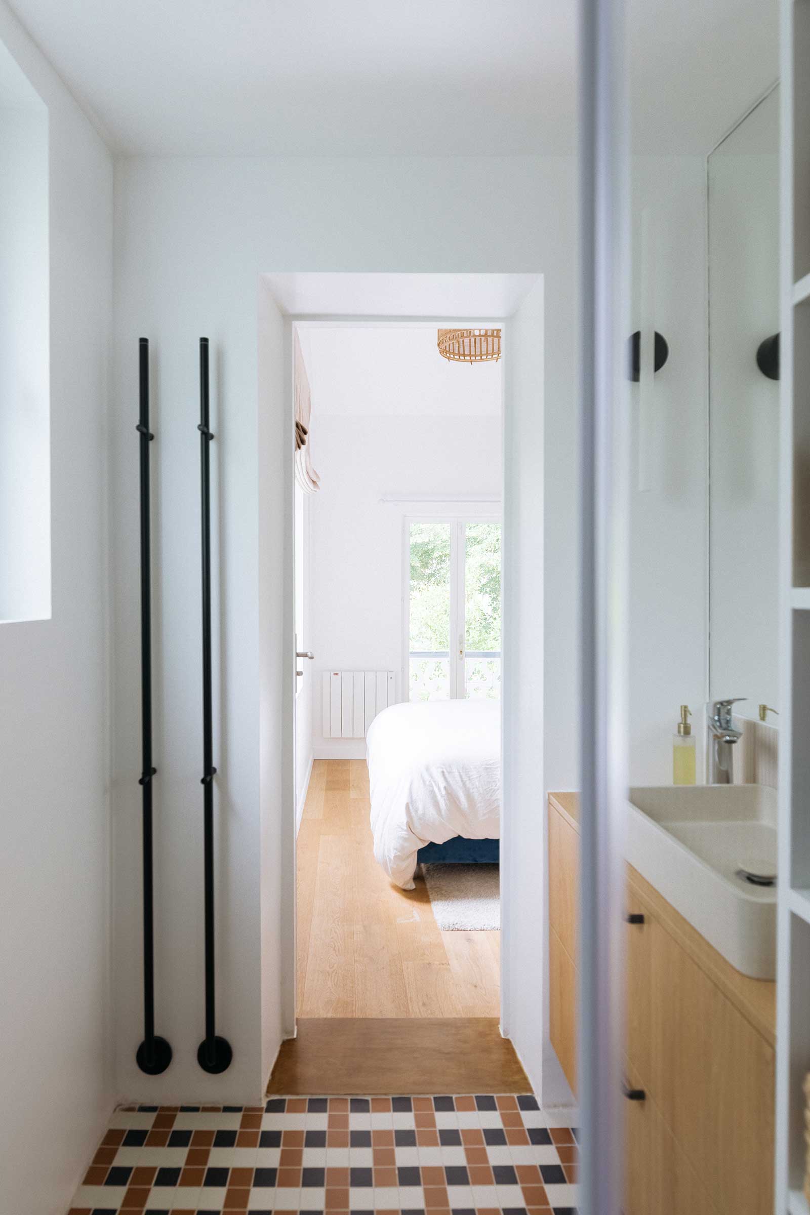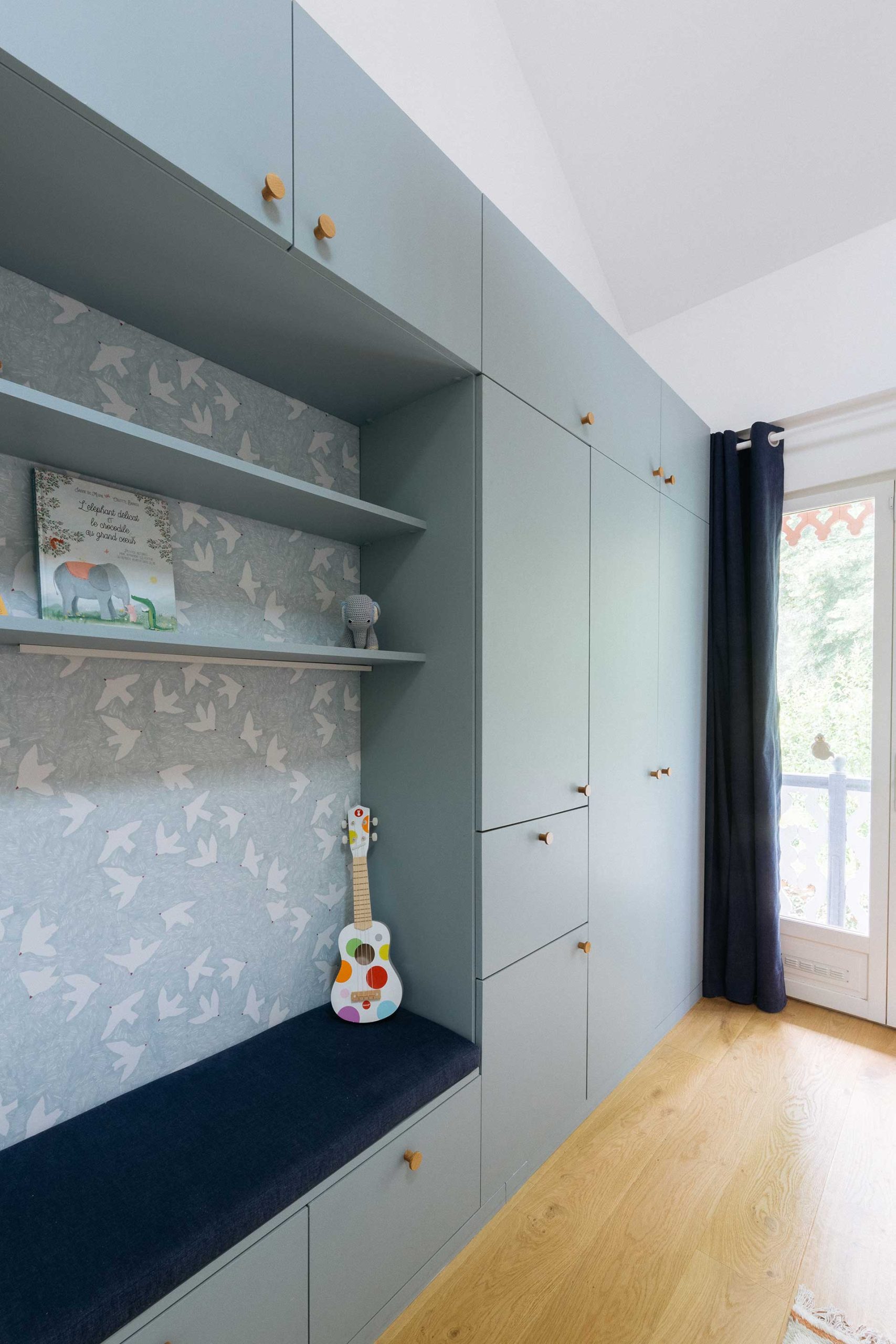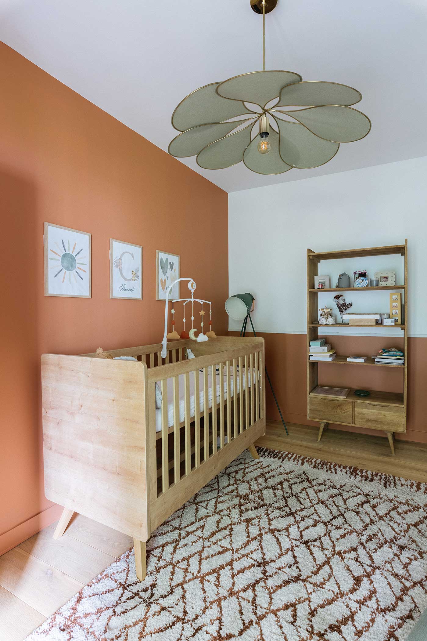 Cette maison manquait de rangements et de personnalité malgré une rénovation récente. J’ai créé des meubles sur mesure et repensé chaque chambre avec des ambiances douces et chic : une chambre enfants optimisée avec claustra modulable, bureau et grand dressing ; une chambre bébé habillée d’une teinte rouille chaleureuse ; et une suite parentale réinventée avec un papier peint panoramique et un mobilier élégant. La salle de bain a également été retravaillée avec un calepinage en grès cérame unique.