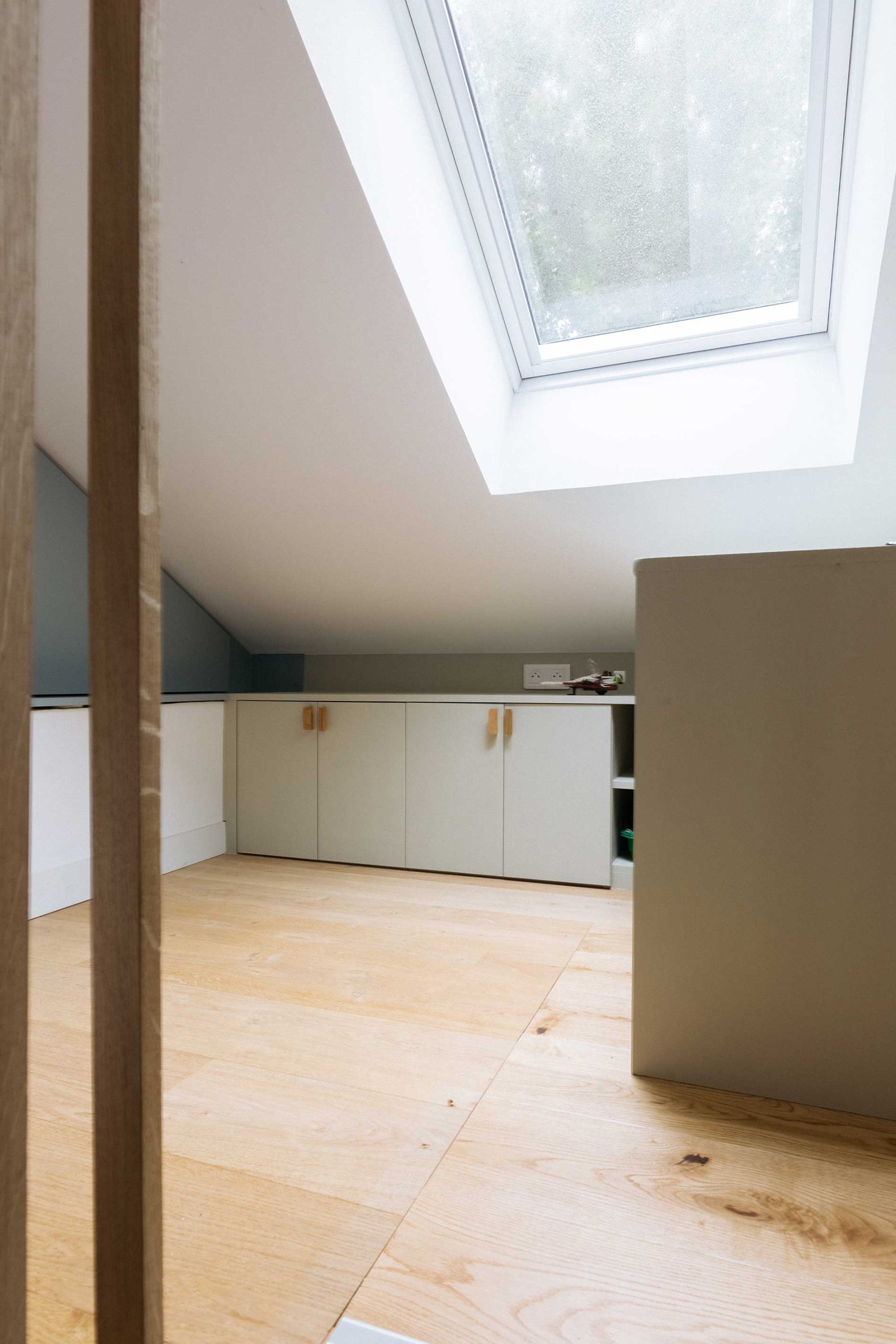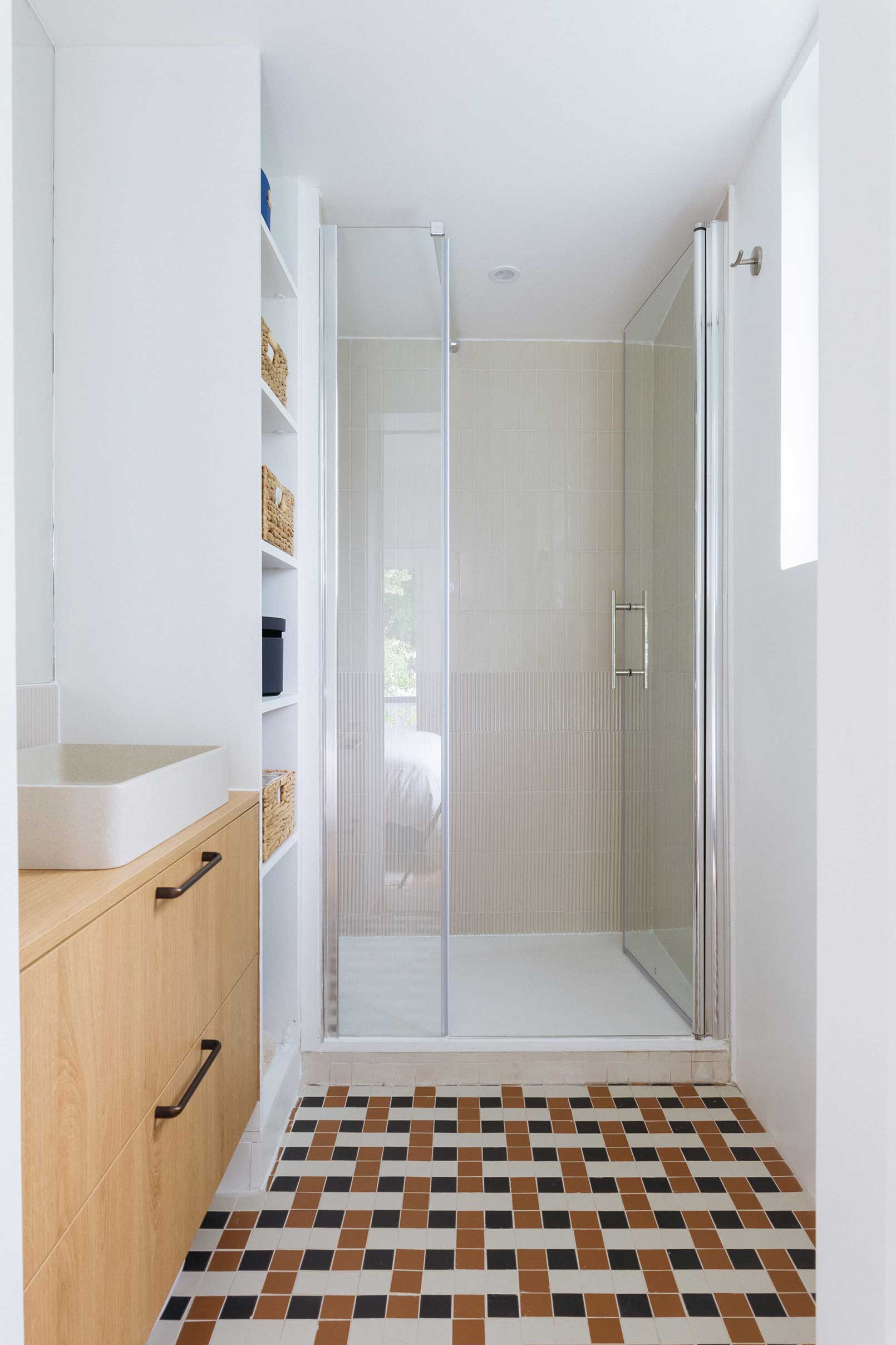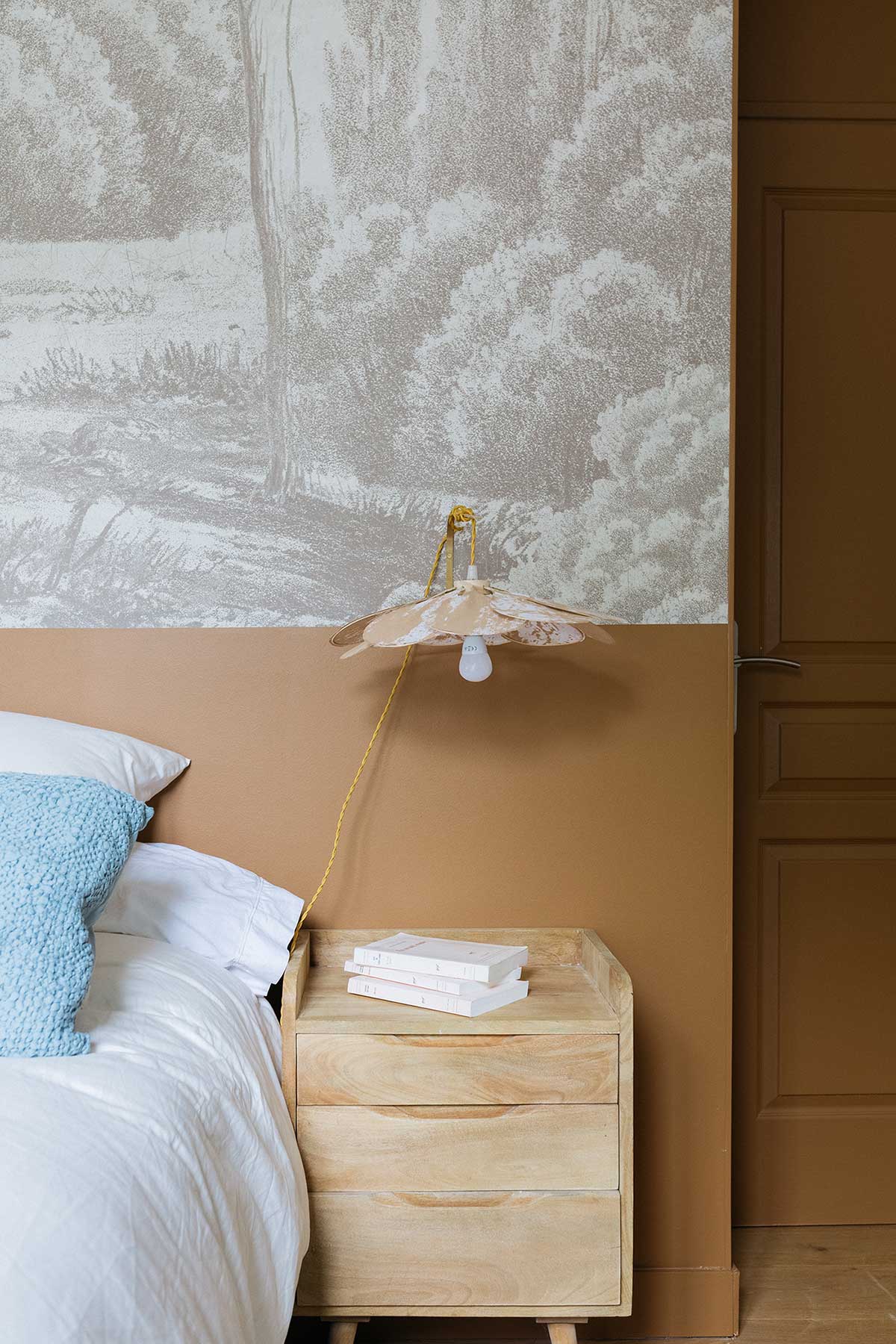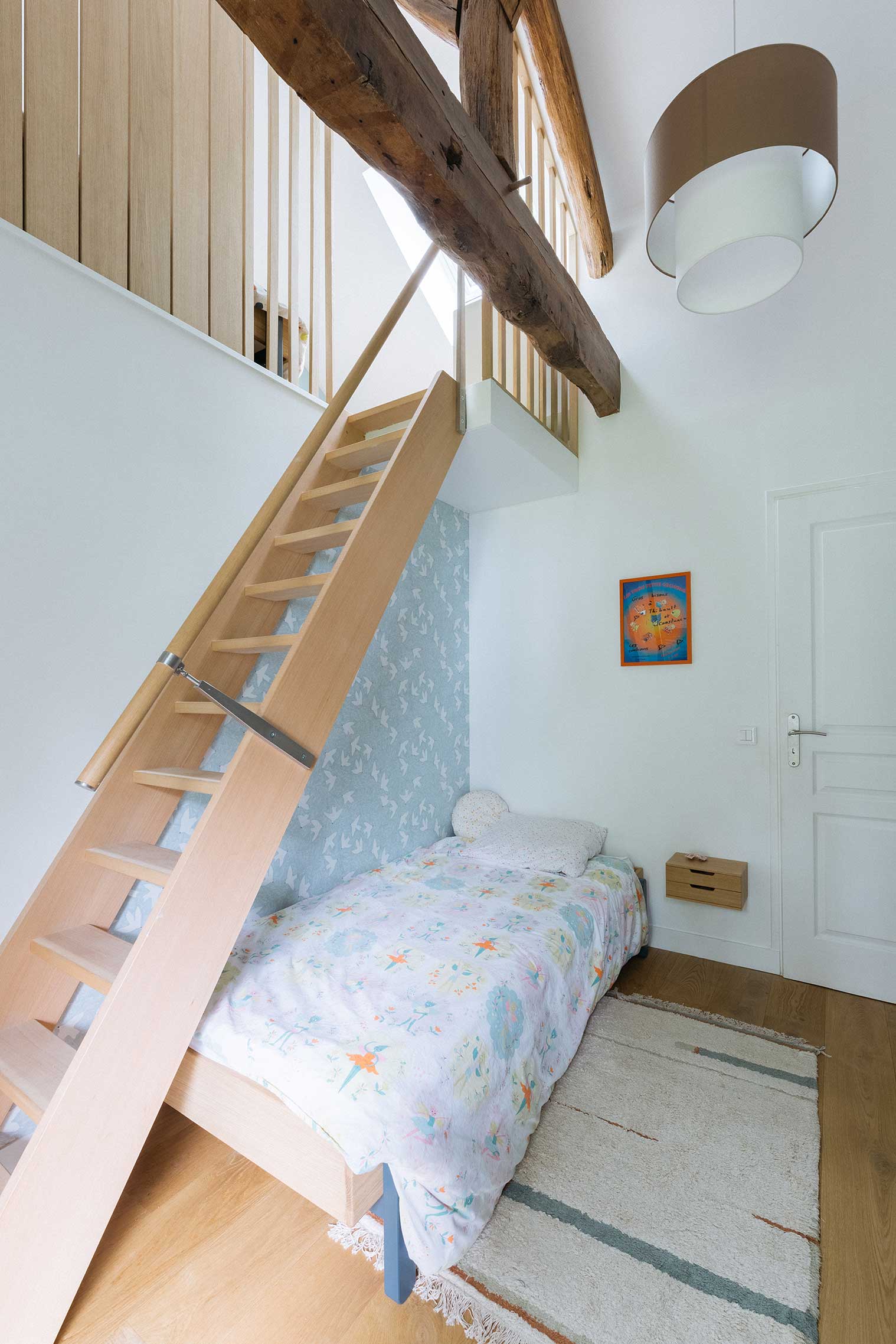 Cette maison manquait de rangements et de personnalité malgré une rénovation récente. J’ai créé des meubles sur mesure et repensé chaque chambre avec des ambiances douces et chic : une chambre enfants optimisée avec claustra modulable, bureau et grand dressing ; une chambre bébé habillée d’une teinte rouille chaleureuse ; et une suite parentale réinventée avec un papier peint panoramique et un mobilier élégant. La salle de bain a également été retravaillée avec un calepinage en grès cérame unique.