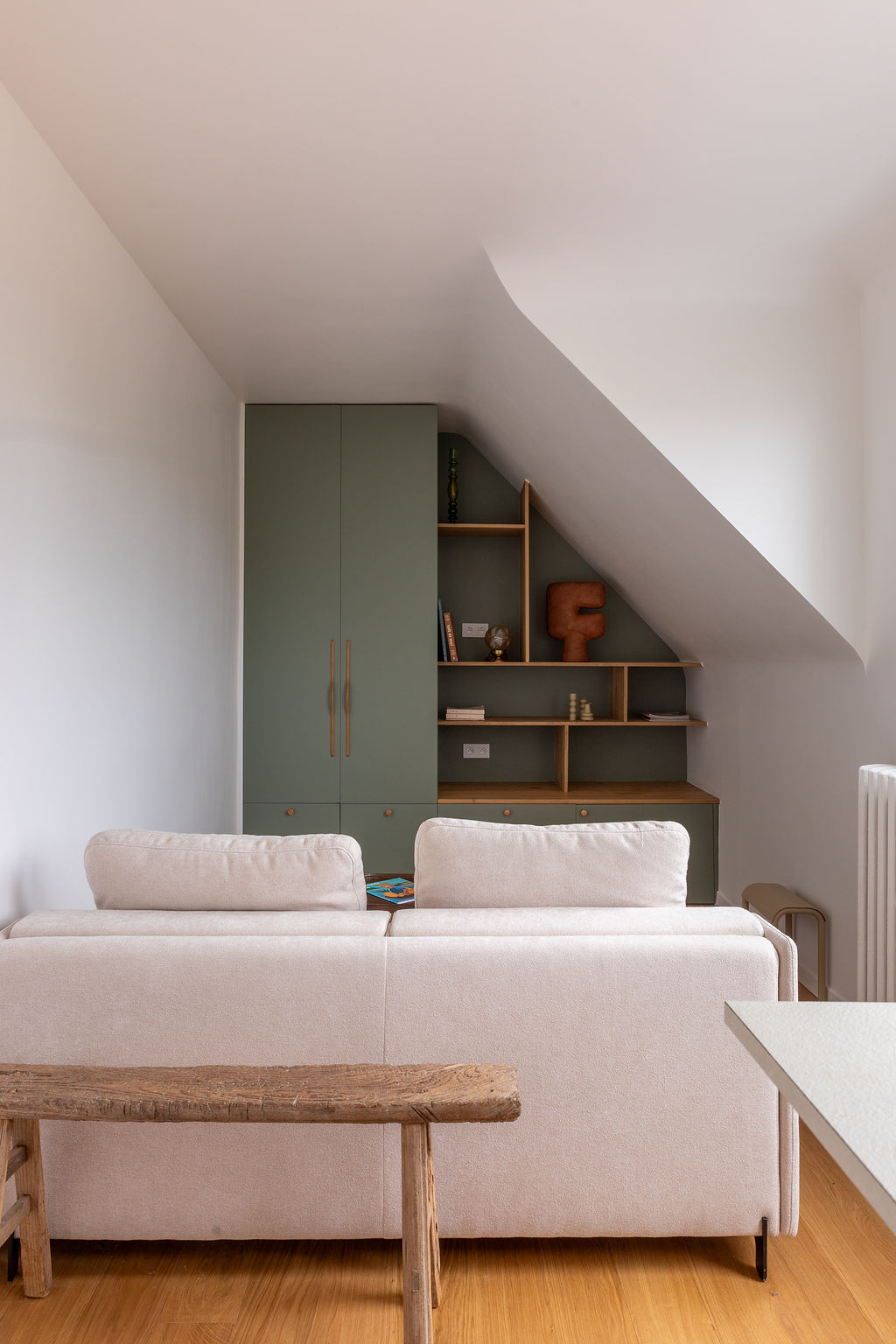 Un studio tout en longueur, avec un véritable challenge de rangement: tout cacher !