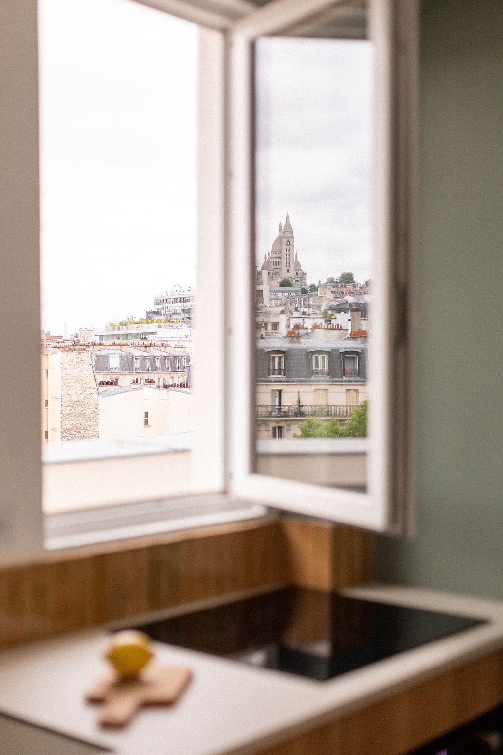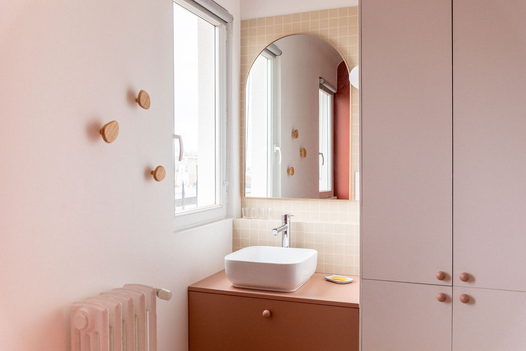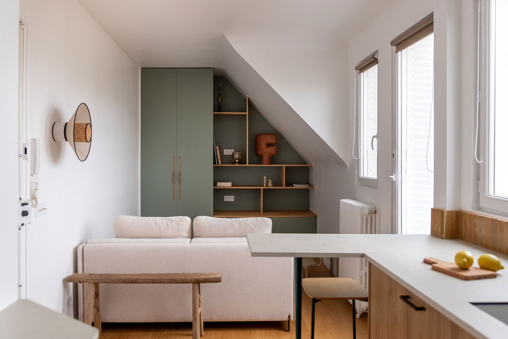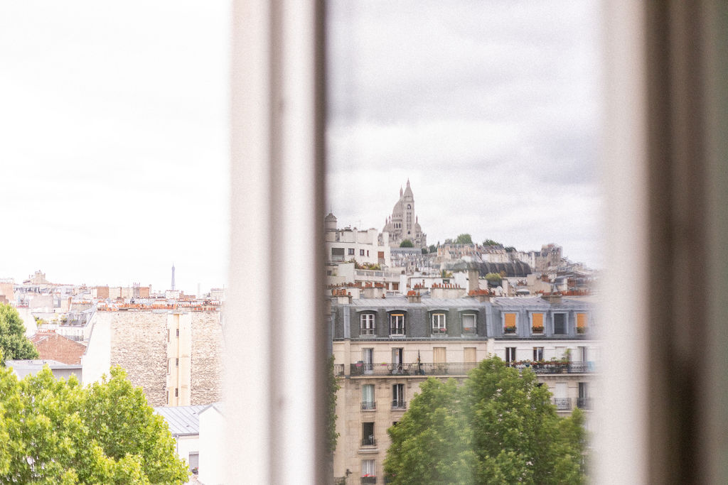 Dans ce pied-à-terre de 23 m², l’objectif était d’offrir à ma cliente un espace pratique et raffiné pour ses allers-retours entre Paris et la province. Chaque fonction a été discrètement intégrée : rangements pour valise, couette, lave-linge, un canapé-lit confortable, une vraie cuisine et une salle de bain agréable. Les couleurs apportent du caractère tout en laissant la magnifique vue sur Montmartre s’exprimer.